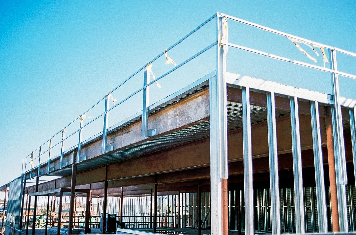 A nice piece of architecture that was under construction on a busy street corner.