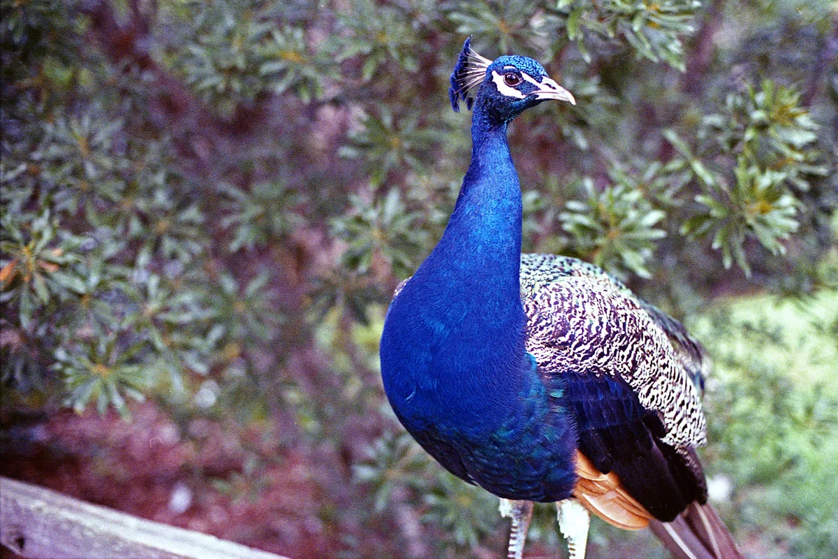 From the gibbon cage, I saw a beautiful peacock sitting all by himself on a fence just across the way. I had NO idea that he would allow me to get this close to him, but I inched my way so very cautiously toward the fence. He eyed me the entire time, and I crouched a bit beneath him, to show his obvious superiority. I mean, look at this guy! He's gorgeous. lol. In doing so, he allowed me to get fairly close. I had my Canon FD 35mm ƒ/2 S.S.C. lens attached at the time, and very gently switched it out for my 50mm, while holding my breath. I snapped this picture, and then I wondered if he would possibly allow me to get closer...